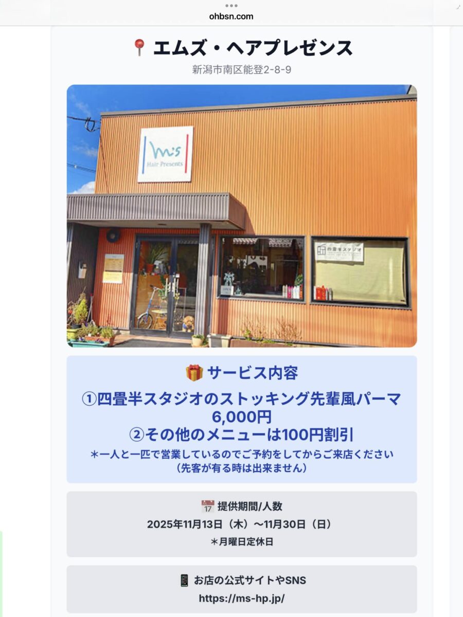 m's hair presents エムズ・ヘアプレゼンス・・・ 新潟市南区にある美容室 お客様1人1人にカット、カラー、パーマで髪や地肌に思いやりをプレゼント。 ナチュラルなヘアスタイルを提案します。TEL025-372-4809 営業時間 午前9時~午後6時30分